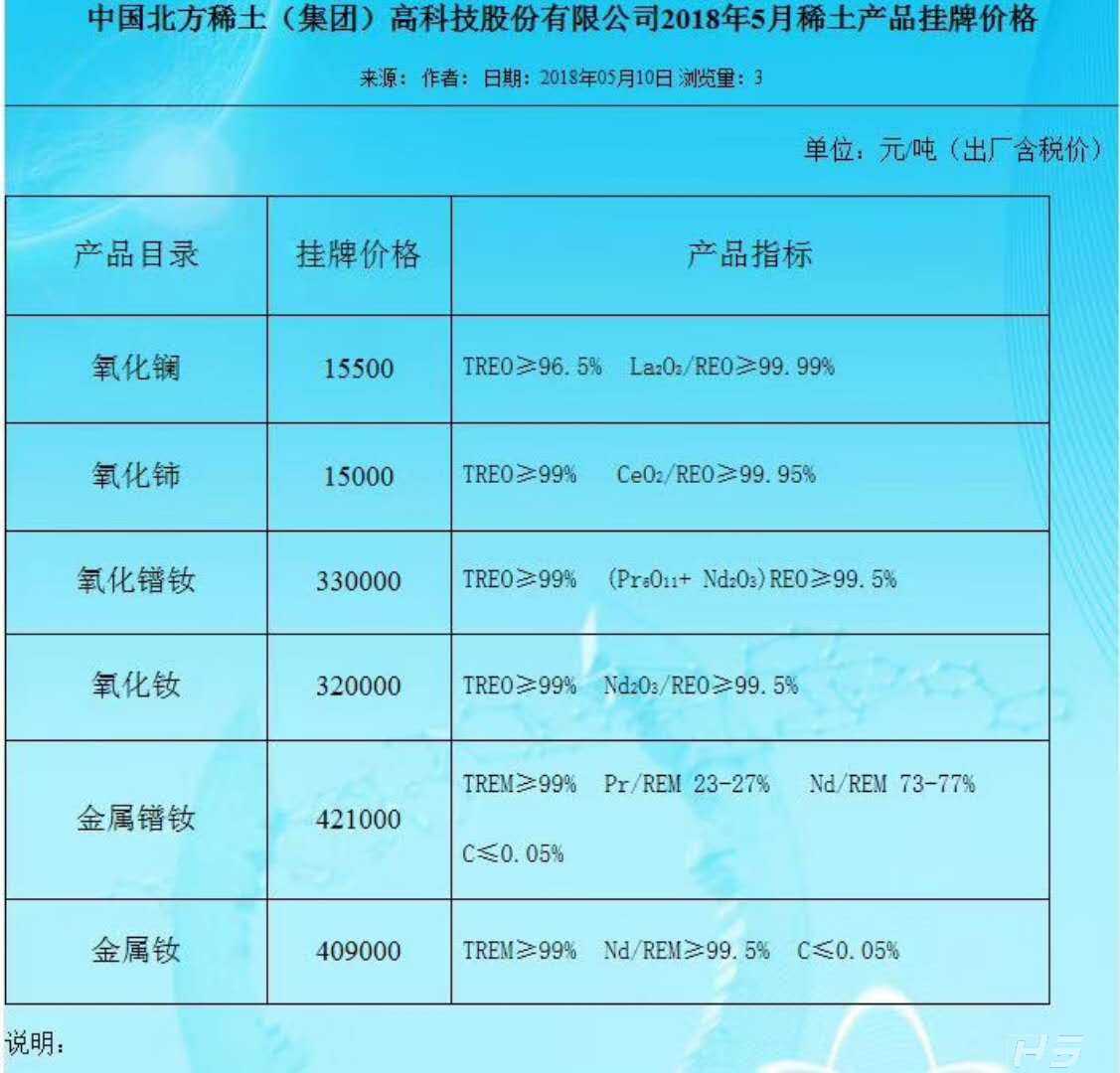 今日中国北方稀土(集团)高科技股份有限公司发布5月份稀土产品挂牌价格,较4月相比,镨钕系产品均有一定幅度下调,氧化镨钕下调至33万元/吨,氧化钕下调至32万元/吨,金属镨钕下调至42.1万元/吨,金属钕下调至40.9万元吨,幅度如下表,与近期稀土市场成交价格持续下跌的现状较为吻合。